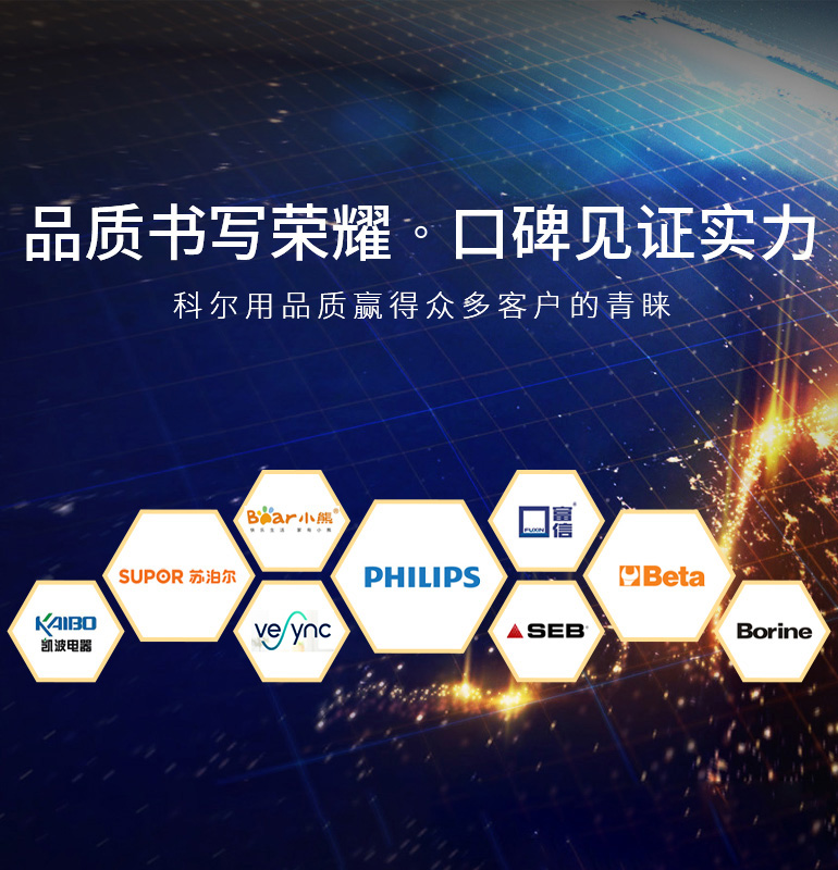 广东科尔科技发展有限公司,成立于1997年,占地面积10000平方米,是产品开发和精密注塑模具制造的专业厂家。已实现制模网络化,生产管理系统化,流程运作平台化,在家电、美容电器、医疗电器、电子产品和汽车内饰件等领域的产品开发和注塑模具方面享有良好的社会声誉和口碑,赢得苏泊尔、东菱、晨北、SEB、飞利浦等国内外优质客户的信赖。